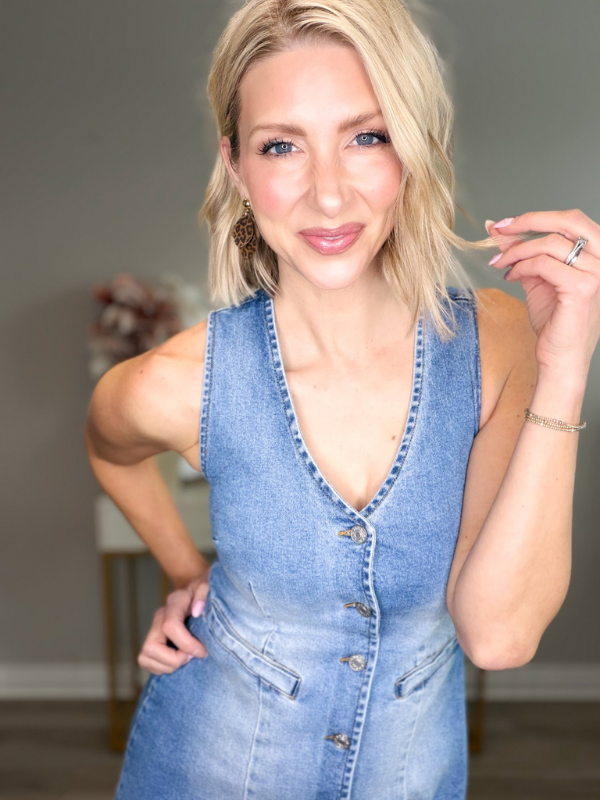 This denim mini is giving effortless cool-girl with a little polished edge 😍💙 It’s fitted in all the right places with a flattering V-neckline, sleeveless cut, and a full button-front that makes styling so easy. The welt-style front pockets add that tailored vibe, and the adjustable back strap lets you customize the fit (aka: snatched but comfy 🙌).