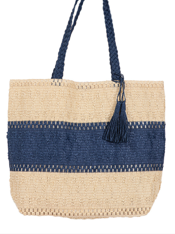 COLOR BLOCK WOVEN STRAW TOTE - NAVY