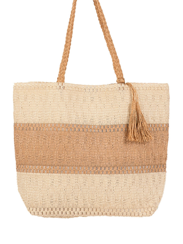 COLOR BLOCK WOVEN STRAW TOTE - TAUPE