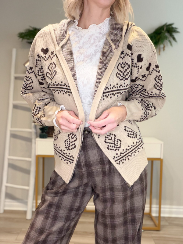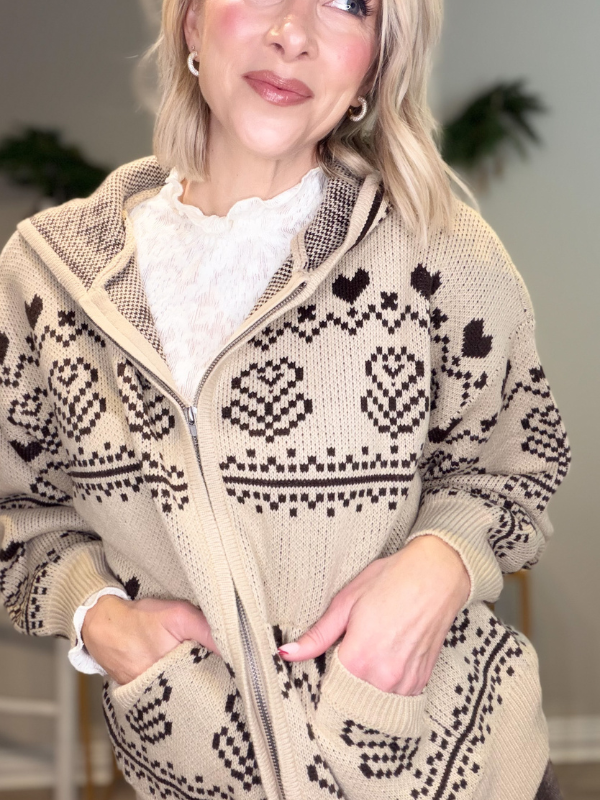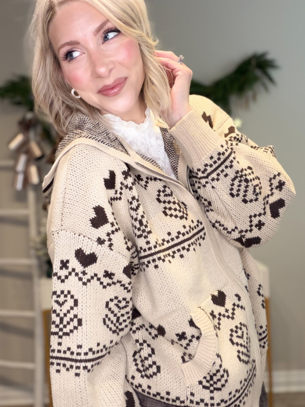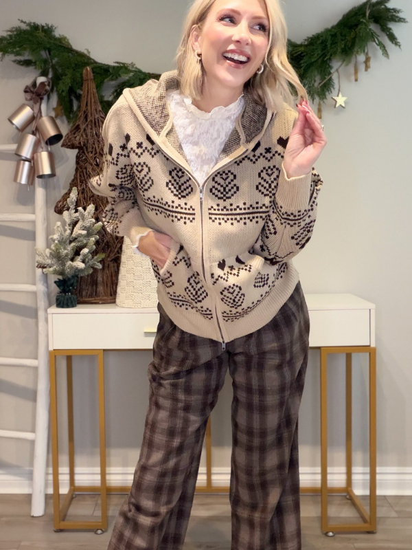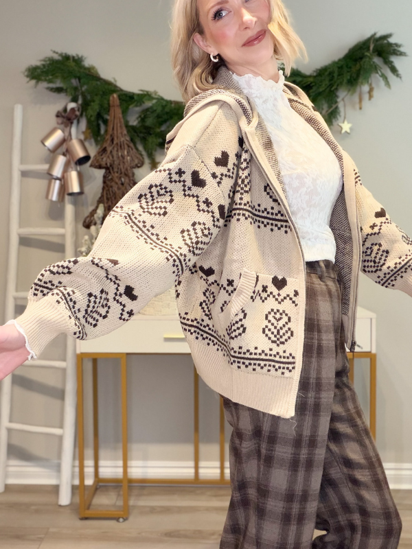 Cozy-girl winter dreams activated. This Nordic-inspired jacquard zip-up hoodie is the perfect blend of comfy, cute, and totally timeless. In a warm taupe base with rich chocolate-brown accents, it brings all the ski-lodge, holiday-market, fireside-cocoa vibes with a touch of valentine flair straight into your everyday wardrobe.