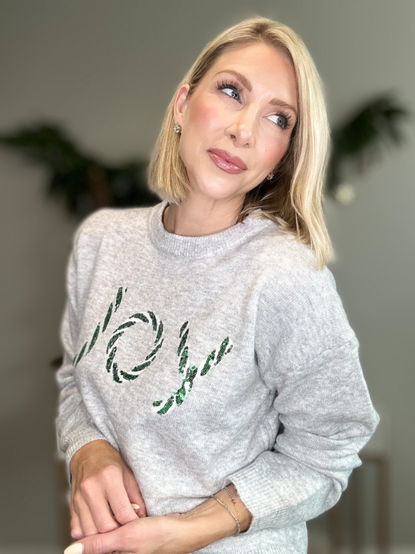 Bring a little JOY to your winter wardrobe 💚✨ This cozy grey holiday sweater features the word “Joy” embroidered in sparkling green candy cane sequins — the perfect mix of festive and chic. The soft knit fabric makes it comfy enough for lounging, yet cute enough to pair with jeans or a skirt for your next holiday gathering.