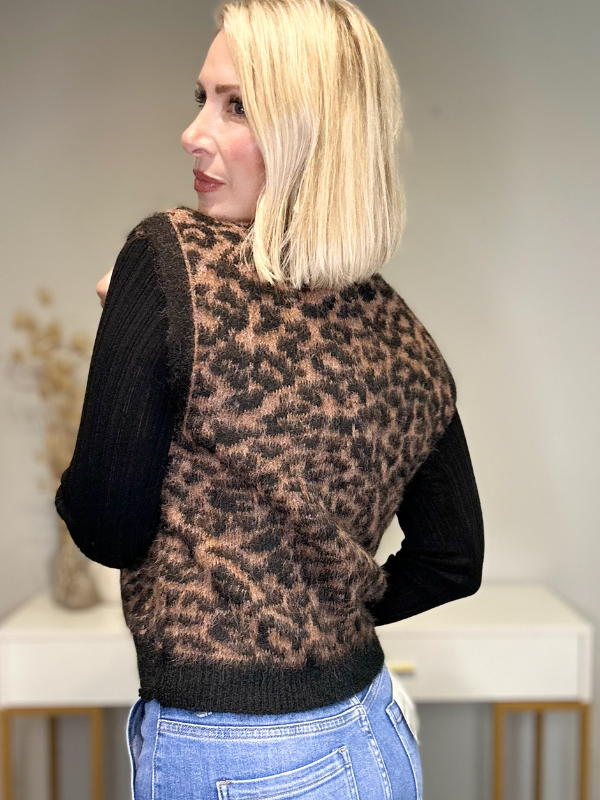 Perfect for layering over a fitted long-sleeve, turtleneck, or even a crisp button-up, it instantly elevates any outfit. Pair it with denim for a casual cool vibe, or style it with trousers or a skirt for a more polished look. This vest blends trend-forward style with timeless animal print flair—making it a must-have in your fall and winter wardrobe.